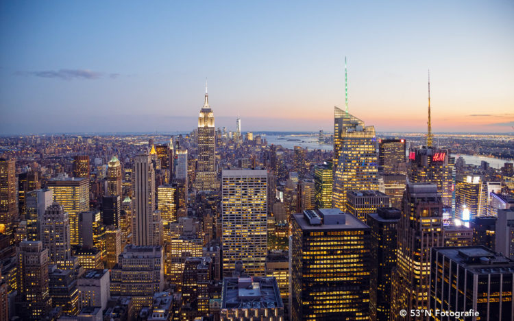 Die Sonne setzt sich allmählich über New York City und taucht die Stadt in ein seichtes, rötliches Licht. Das Empire State Building erhebt sich über die umliegenden Gebäude und weit im Hintergrund thront das neue One World Trade Center.